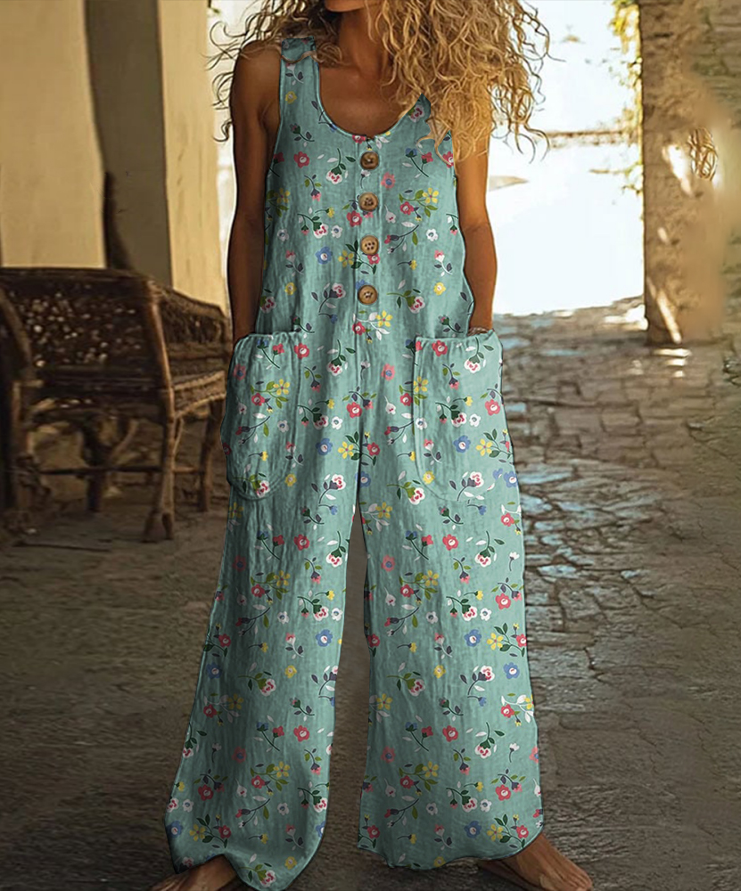 Vintage Floral Art Print Casual Wide Leg Jumpsuit