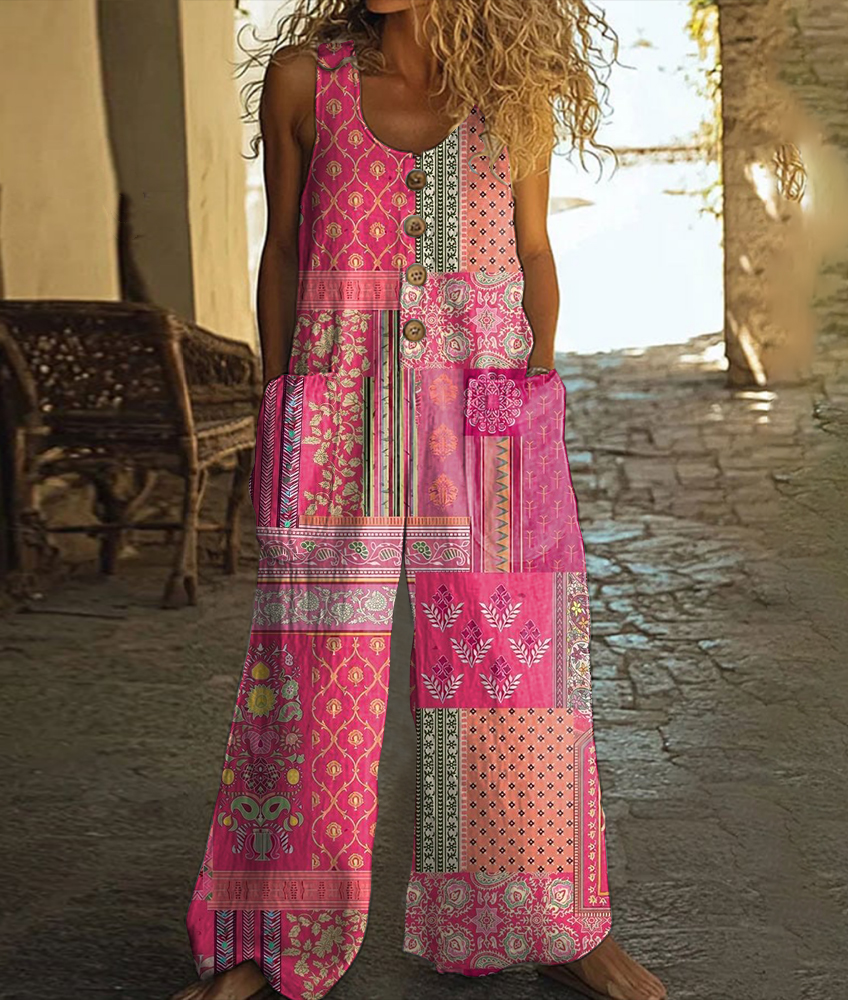 Vintage Floral Art Print Casual Wide Leg Jumpsuit