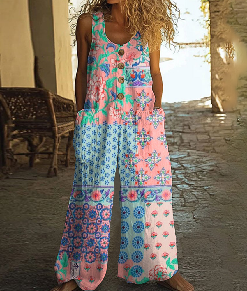 Vintage Floral Art Print Casual Wide Leg Jumpsuit