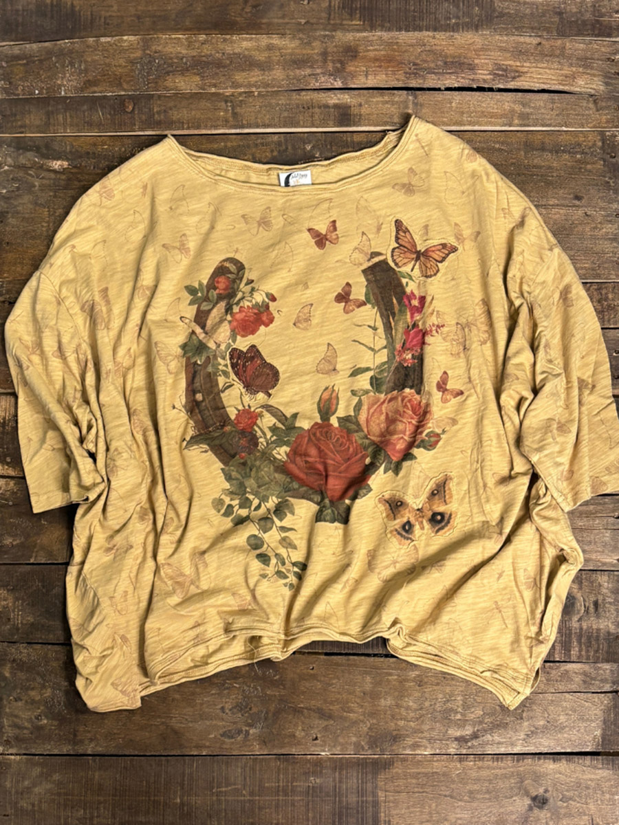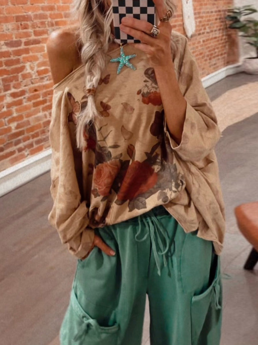 So cool and classic in an oversized, relaxed fit. These timeless top features a vintage wash look with an open neckline to easily wear on or off shoulder.