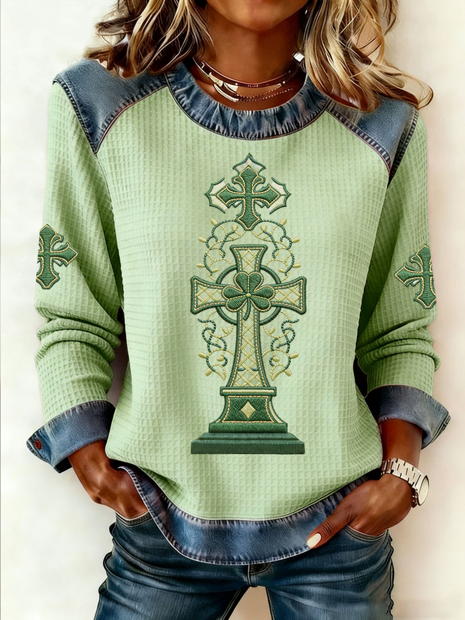 Women's Autumn/Winter St. Patrick's Day Faux Denim Print Top