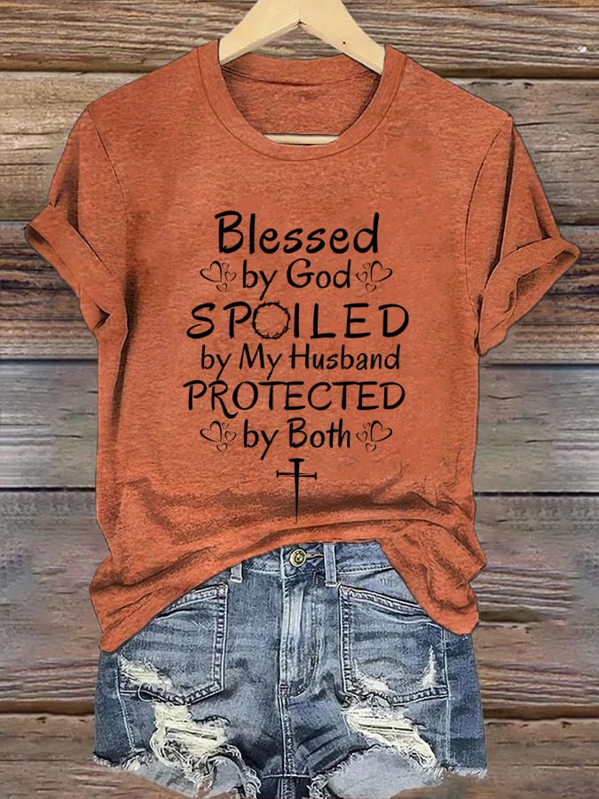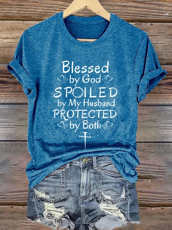Women's Blessed by God Spoiled by my Husband Protected by Both Print T-Shirt