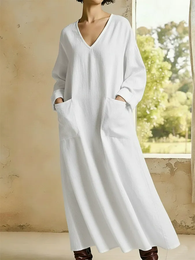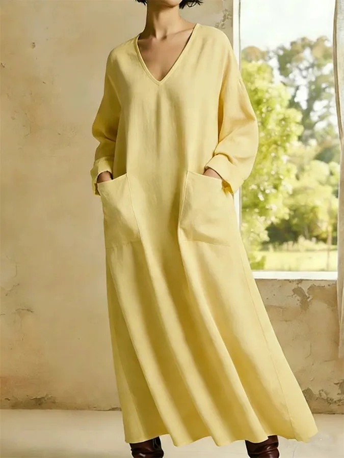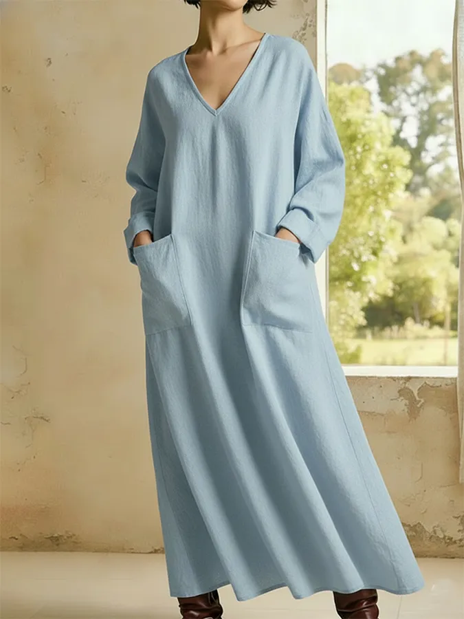 Women'S Casual V-Neck Loose-Fitting Long-Sleeved Dress With Pockets