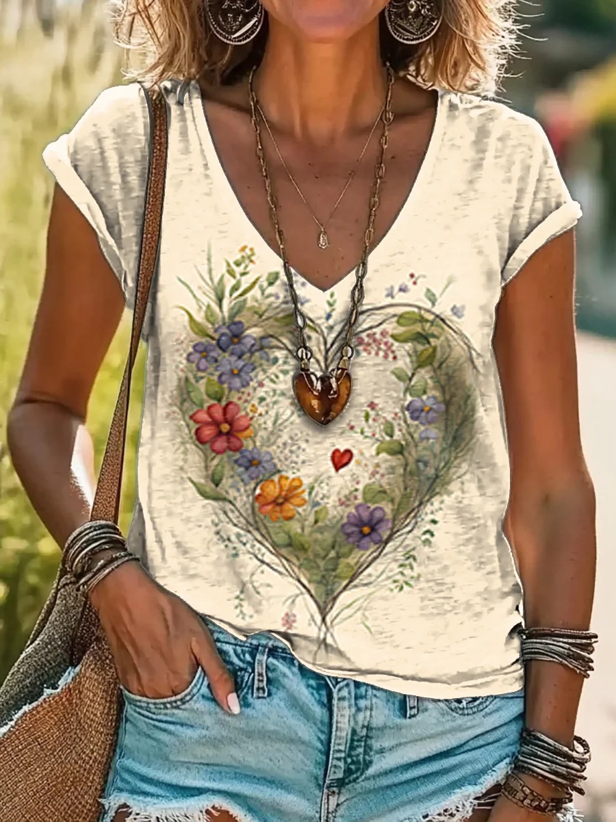 Women's Floral Heart Art V-Neck Casual T-Shirt