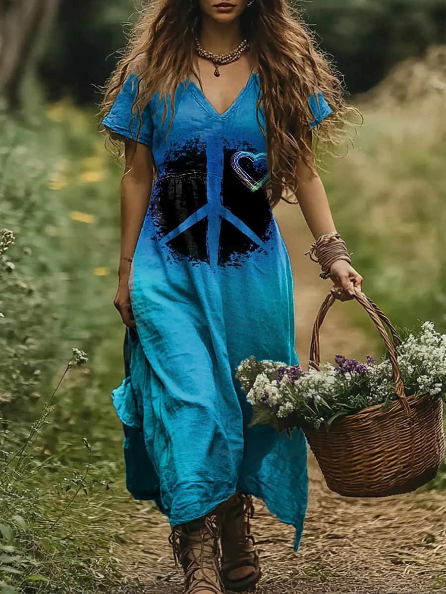 Women's Hippie Art Print V-neck Casual T-Shirt