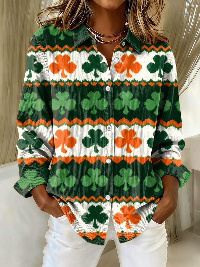 Women's St. Patrick's Day Shamrock Print Corduroy Design Shirt