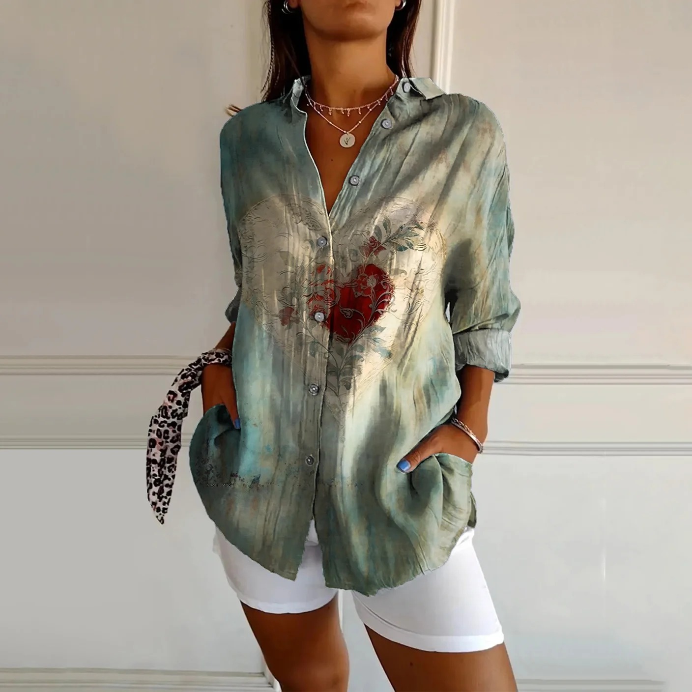 Women's V-Neck Casual T-Shirt with Heart Tattoo Art Print