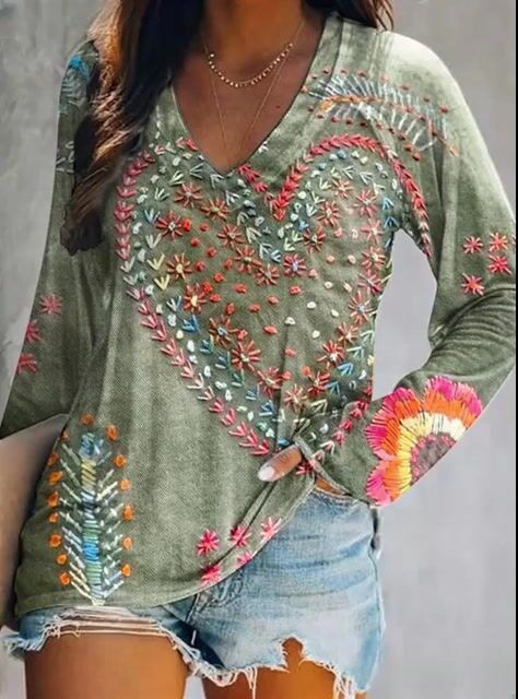 Women's Vintage Bohemian Floral Art Print Casual V Neck Long Sleeve Tops
