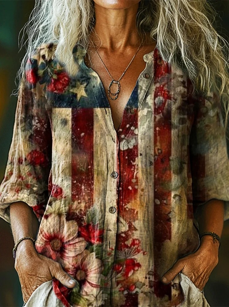 Women's Vintage Flag Floral Art Print V-neck Casual T-Shirt