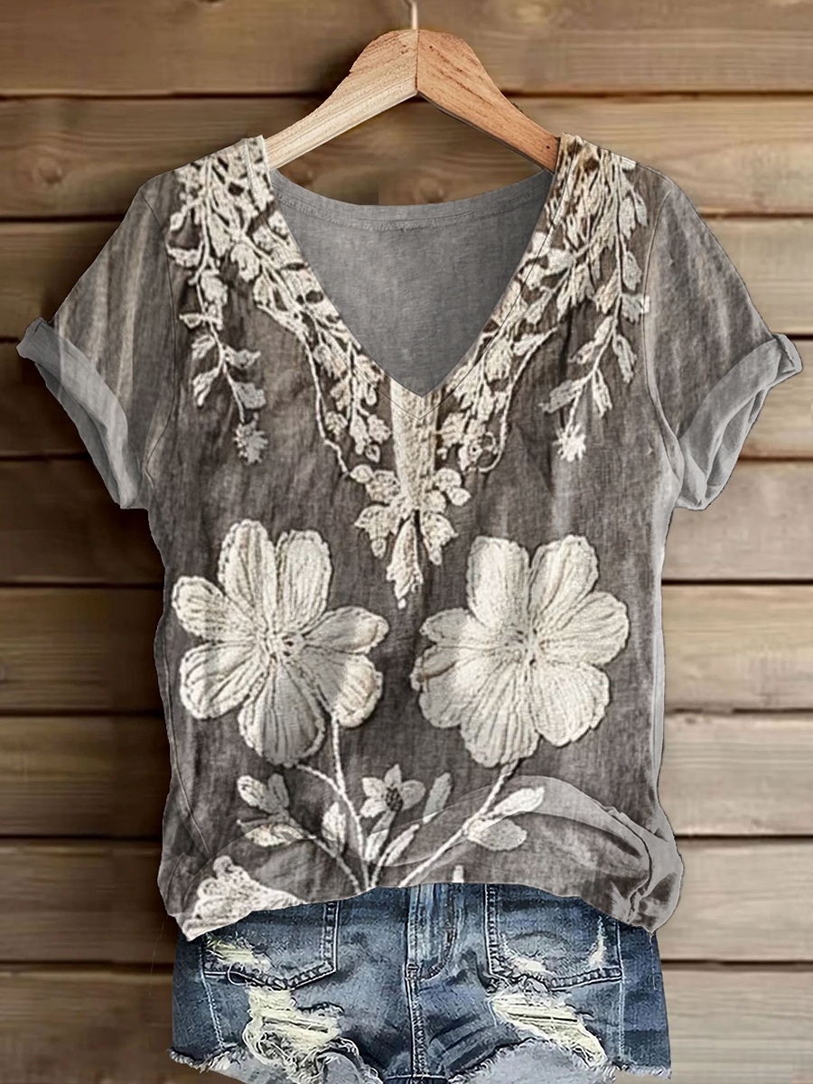 Women's Vintage Floral Art Print V-Neck Short Sleeve Cotton T-Shirt