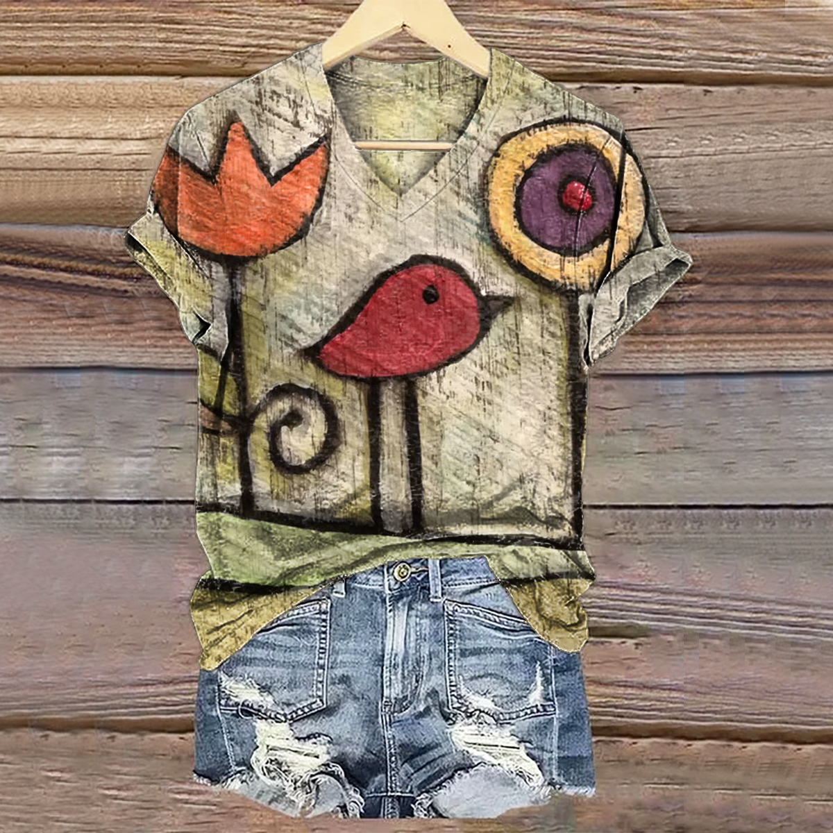 Women's Vintage Floral Bird Art Print V-neck Casual T-Shirt
