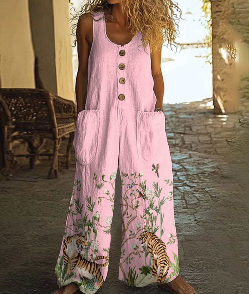 Women's Vintage Tropical Leopard Art Print Casual Wide Leg Jumpsuit